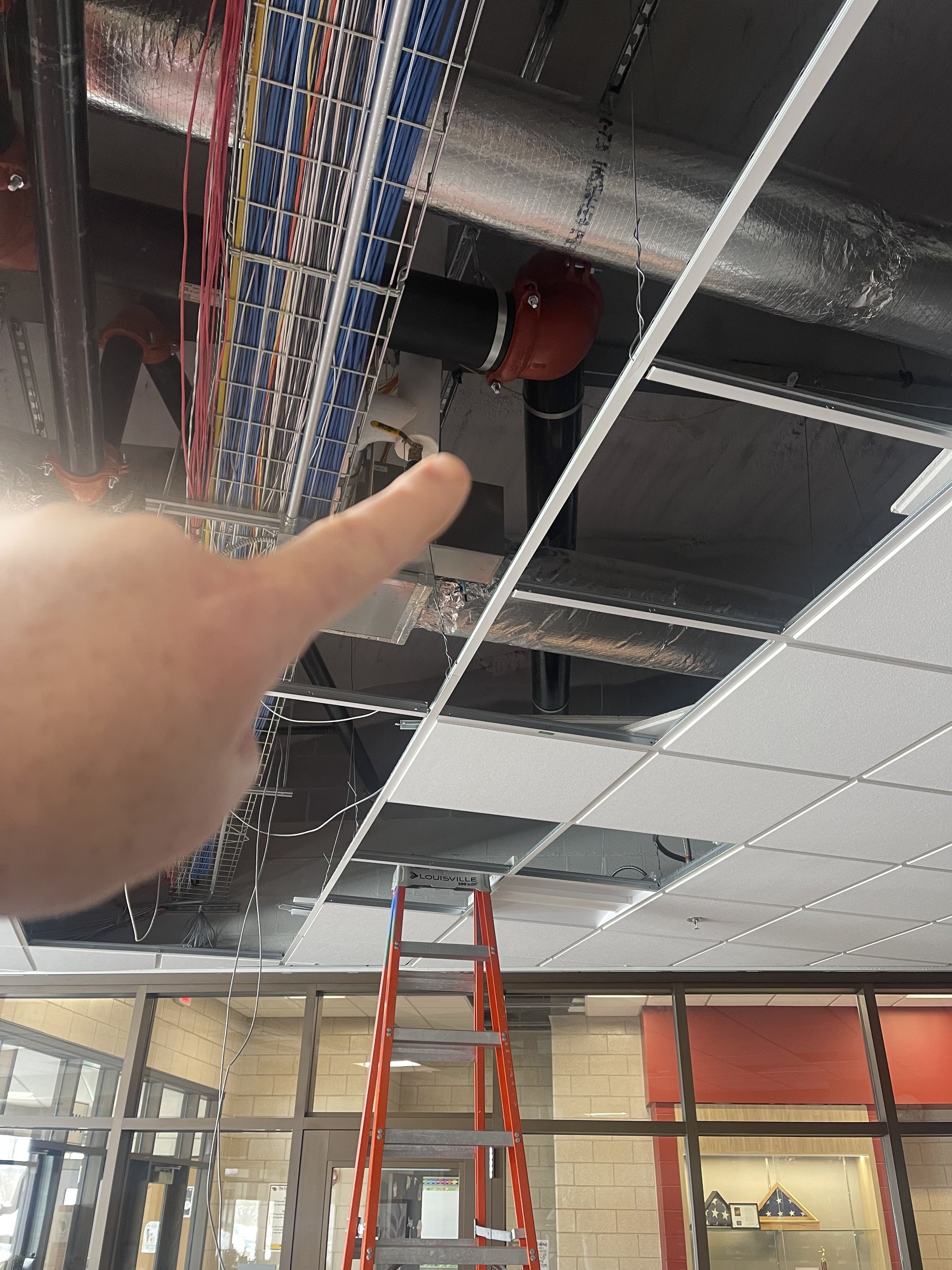 Design and bid work are complete, so during spring break crews were able to remove corridor flooring at the Middle/High School building and begin installing new fire-protection piping while our District Maintenance Team has also been busy painting the middle/high school hallways. Site preparations are also moving forward on the new athletic field, and interior renovation work is scheduled for this summer.